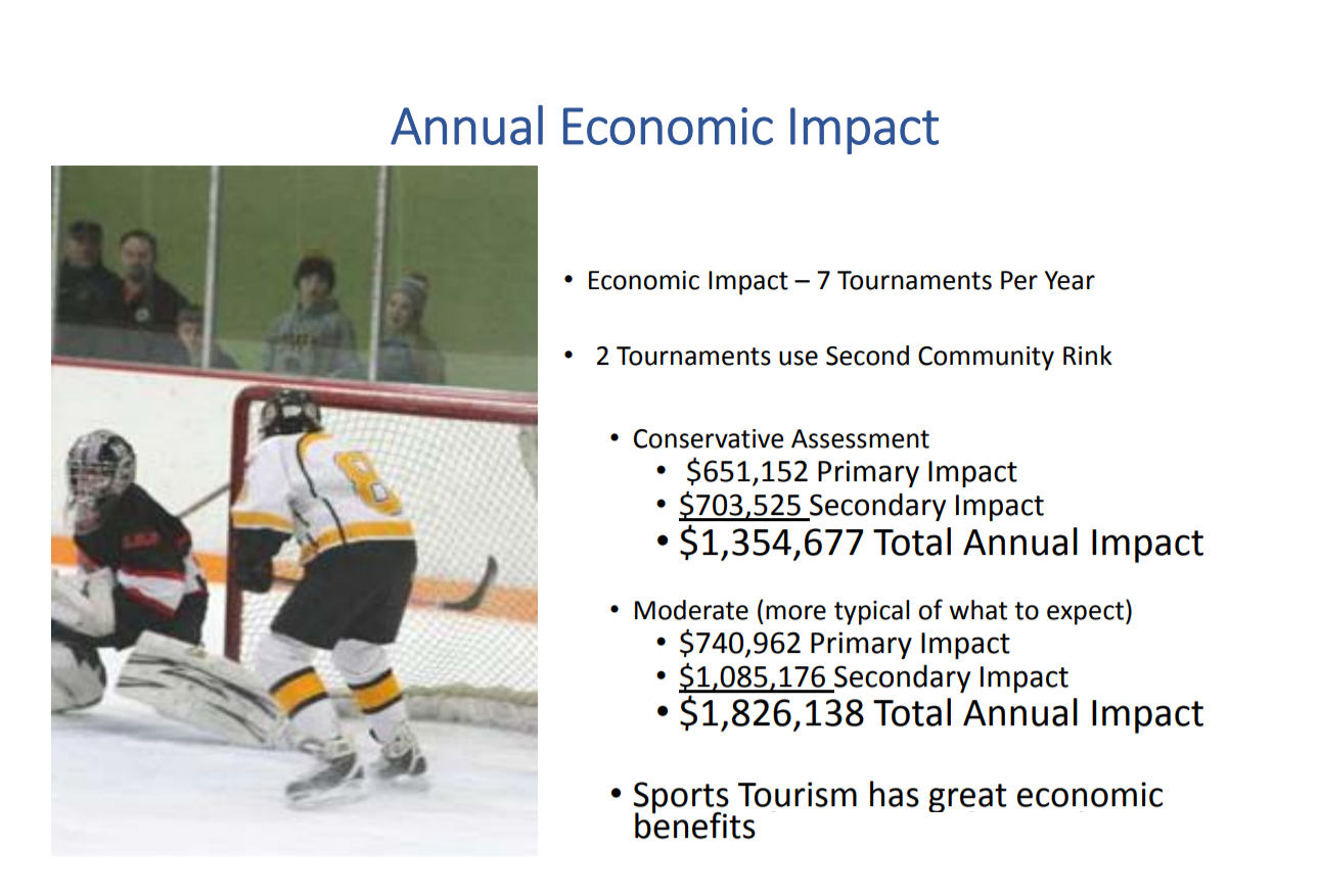 Different assumptions can be made to get different results but projecting $650,000 (Conservative direct) to $1,800,000 (Total Sports Tourism) of positive economic impact annually of having 2 sheets free for hosting 7 tournaments annually (Two of the Tourneys use both sheets).